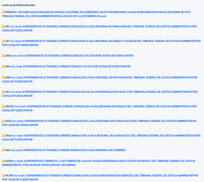 Conforme a lo dispuesto en el numeral 1º de la Ley Federal de Procedimiento Contencioso Administrativo; Primero y Segundo del Acuerdo SS/6/2018, que regula el “procedimiento para determinar la suspensión de labores en las Salas Regionales por casos urgentes, fortuitos o de fuerza mayor”, emitido por el Pleno General de la Sala Superior del Tribunal Federal de Justicia Administrativa, diversas Salas Regionales de ese Tribunal, el día 23 de febrero de 2026, suspenderán sus actividades por causas de fuerza mayor, motivo por el cual no correrán términos ni plazos procesales previstos en la normatividad que regula el procedimiento contencioso administrativo federal.